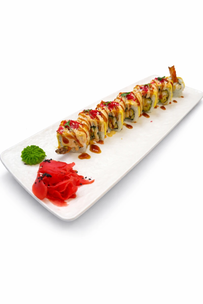 Эффектный ролл «Планета» — яркий и сытный выбор для любителей запечённых и темпурных роллов. Ролл готовится на основе риса и листа нори, с хрустящей эби темпура, свежим огурцом и нежным сыром чеддер. Дополняется майонезом, икрой тобико и посыпается чёрно-белым кунжутом. Сверху — аппетитный соус, подчёркивающий насыщенный вкус и сочную текстуру. Подаётся с васаби и маринованным имбирём — идеальное сочетание для яркого гастрономического удовольствия.